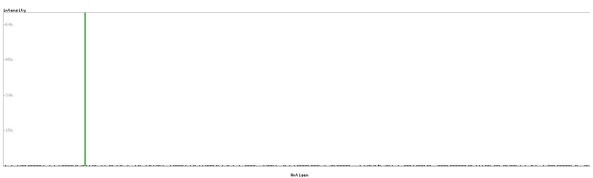 At the top of the view, the position of the antigen (identified by the corresponding HPA identifier) is shown as a green bar. A yellow triangle on the bar indicates a <100% sequence identity to the protein target.
