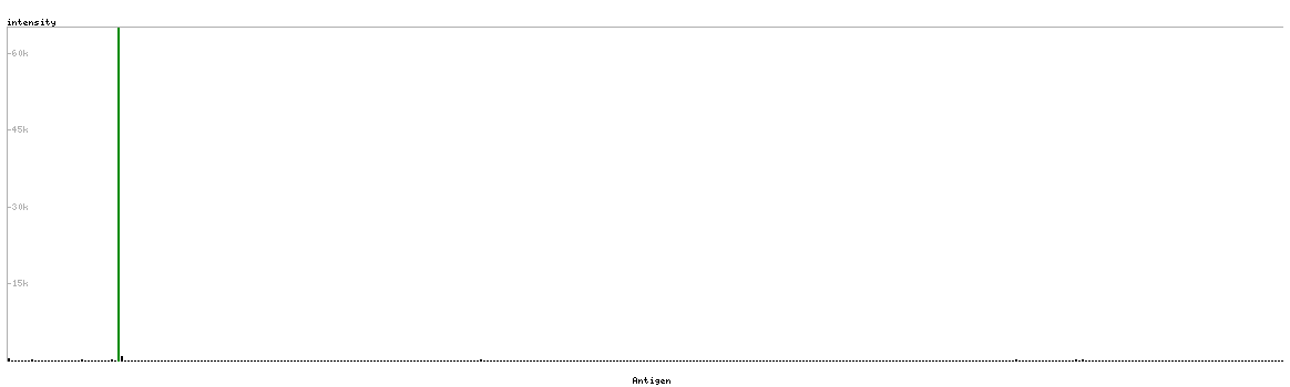 At the top of the view, the position of the antigen (identified by the corresponding HPA identifier) is shown as a green bar. A yellow triangle on the bar indicates a <100% sequence identity to the protein target.