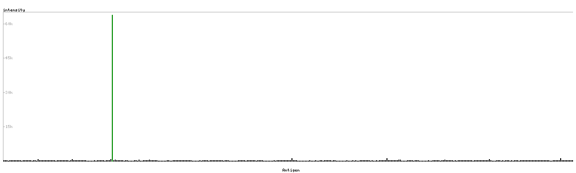 At the top of the view, the position of the antigen (identified by the corresponding HPA identifier) is shown as a green bar. A yellow triangle on the bar indicates a <100% sequence identity to the protein target.