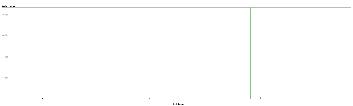 At the top of the view, the position of the antigen (identified by the corresponding HPA identifier) is shown as a green bar. A yellow triangle on the bar indicates a <100% sequence identity to the protein target.