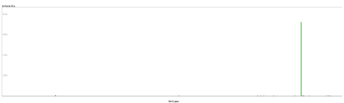 At the top of the view, the position of the antigen (identified by the corresponding HPA identifier) is shown as a green bar. A yellow triangle on the bar indicates a <100% sequence identity to the protein target.